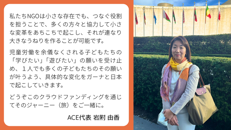 ACEはこれからもその想いを背負い、児童労働を余儀なくされる子どもたちの「学びたい」「遊びたい」の願いを受け止め、1人でも多くの子どもたちのその願いが叶うよう、具体的な変化をガーナと日本で起こしていきます。
