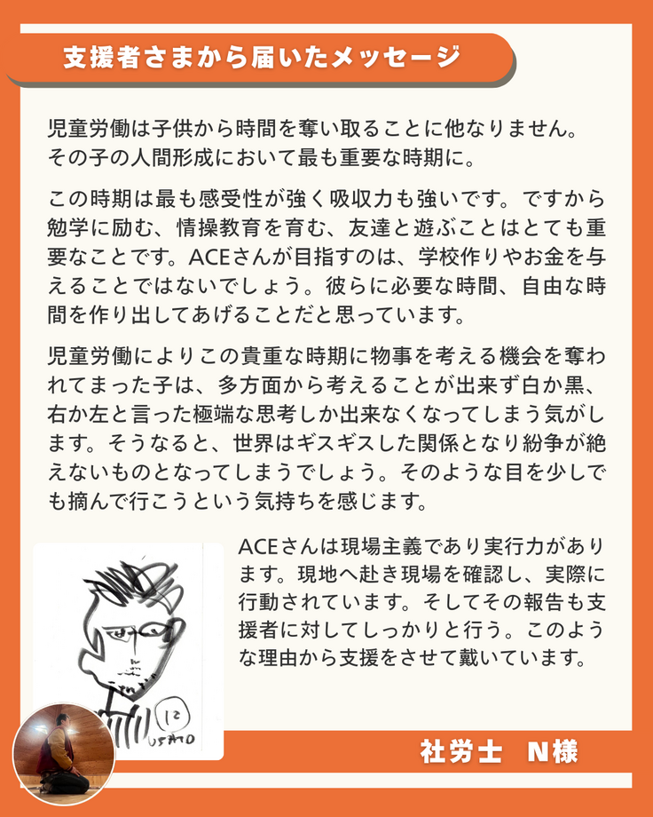 今日は、私たちの想いに共感してくださっている『社労士 N様』から届いた応援のメッセージをご紹介させていただきます。ぜひご覧ください!