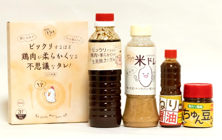 試行錯誤してようやく誕生した商品が「ビックリするほど豚肉が柔らかくなる生姜焼きのタレ」や「米ドレッシング」といったオリジナル商品です。現在はオリジナル商品を販売をしながら頑張っています。