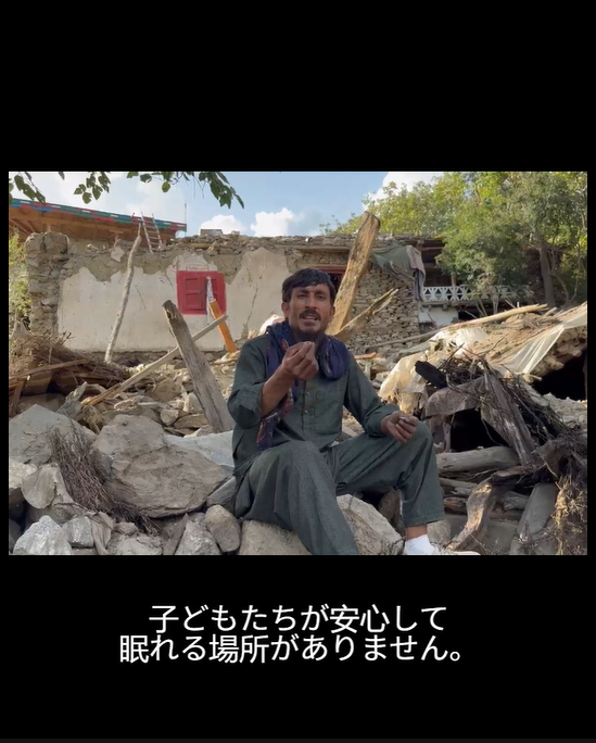「深夜の地震で家が崩れ、息子と娘を失いました。残る子どもたちは病院にいます。家畜も家もなくしました。雨が降っているのに、雨をしのぐテントもありません。」