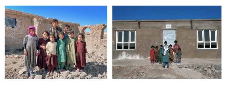 こちらの写真は、2023年の地震で壊滅的な被害を受けたヘラート県の村のビフォー・アフター。支援で届けることができた災害に強い右の家で、出稼ぎ中の父親を安心して待てるようになった家族です。(写真には映っていない高齢の方、女性も一緒に暮らしています)