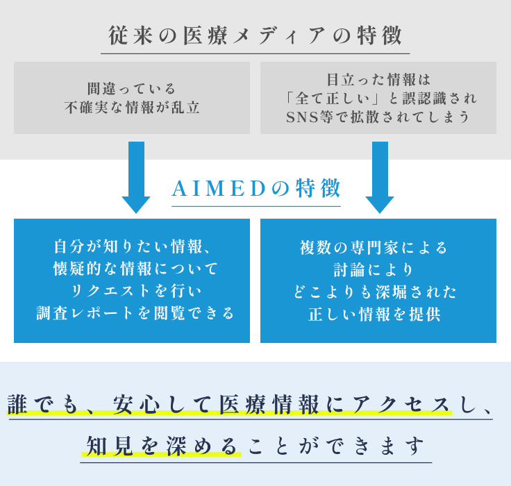 このようなリスクを世の中から減らすために、AIMEDは「もう迷わない」ための信頼性の高い専門知を提供すべく発足しました。
