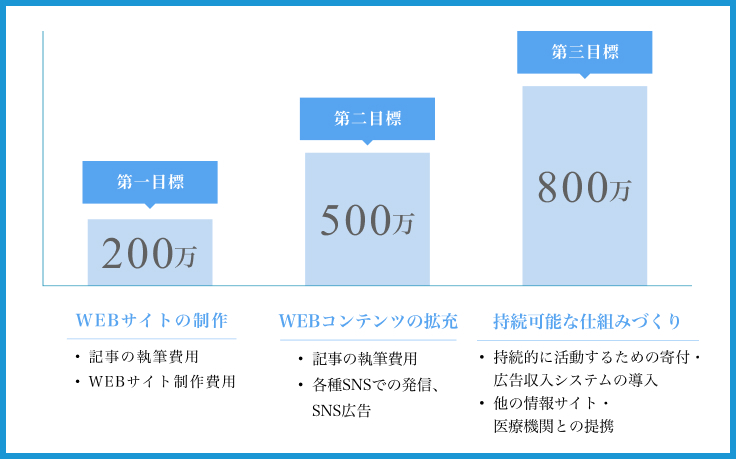 一般社団法人 正しい医療知識を広める会が、ウェブサイト構築費用として200万円を使用します。主な資金用途は後述の通りです。記事の執筆費用(執筆者、編集者への報酬)、ウェブサイト作成費用、記事の執筆費用等
