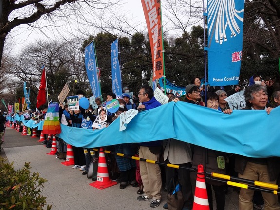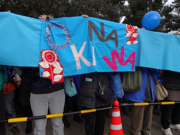 先日の赤をまとった女性たちのアクション「女の平和」国会ヒューマンチェーンに続き、昨日は青をまとってのアクション「沖縄の民意を無視するな!辺野古に基地はつくらせない!」国会ヒューマンチェーンが行われました。「もう基地はいらない!」という沖縄の人々の声を無視し続け、政府が強引に推し進めている沖縄・辺野古の新基地建設に反対の意思を示そうというアクションです。