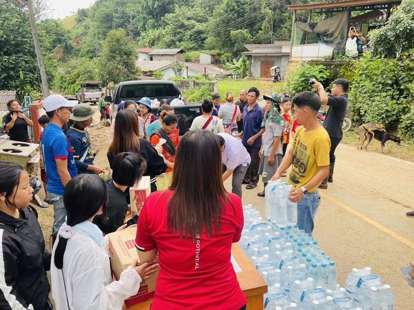 チェンライ全域で、メーコック川流域の大氾濫が起きましたが、幸いセンスック子供寮は山の中腹にあり、洪水被災の難を避けられました。しかしながら子供たちの親が生計の糧とする焼畑は完全に冠水してしまい、平地部のアカ族集落は壊滅状態になっています。 災害を免れたセンスック寮の7歳から15歳までの子供たち64人は早速、自らの食材や日用品、飲み水、自給自足の為に自ら田植えして収穫したお米も被災地に届けました。