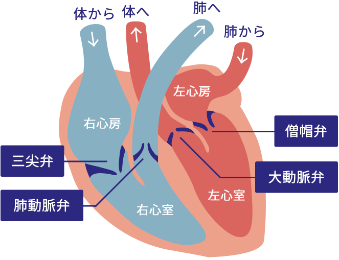 全身からかえってきた血液はまず右心房に入ります。右心房からは「三尖弁」を通過し、右心室へ入ります。右心室からは「肺動脈弁」を通過し肺へ流れ、二酸化炭素と酸素を交換して左心房へかえってきます。左心房から左心室へは「僧帽弁」という弁を通過し流れていきます。左心室からは「大動脈弁」を通過し、全身へと流れていきます。