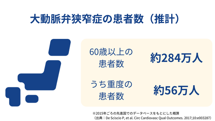大動脈弁狭窄症の罹患率は60〜74歳で2.8%、75歳以上で13.1%と報告されています。特に日本では平均余命の伸長に伴って人口の高齢化が進行することで、症候性の重度大動脈弁狭窄症に罹患している患者数が急激に増加しています。2015年ごろの先進国でのデータベースをもとにした概算では、60歳以上の患者数は約284万人、そのうち重度の患者数は約56万人とされています。(出典:De Sciscio P, et al. Circ Cardiovasc Qual Outcomes. 2017;10:e003287)