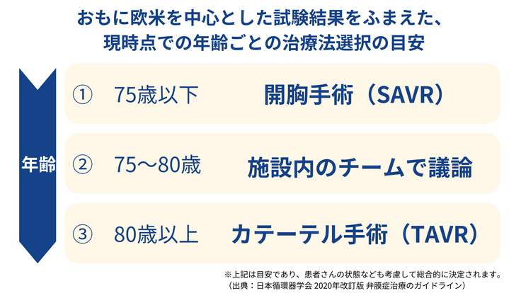実際の診療では、どちらの治療を選択するか悩ましいことがよくありますが、現在のガイドラインでは欧米を中心に行われた「手術リスクが低い患者さんに対する試験」(出典:Mack MJ. N Engl J Med. 2019 May 2;380:1695-1705.)の結果をもとに、「80歳以上はカテーテル手術」、「75歳以下は開胸手術」、「75から80歳は施設内のチームで議論」が推奨されています。(出典:日本循環器学会 2020年改訂版 弁膜症治療のガイドライン)