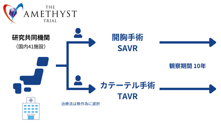 この研究の目的は、日本国内における大動脈弁狭窄症の手術リスクが低い患者さんへの開胸手術(SAVR)の有効性および安全性を、カテーテル手術(TAVR)を対照として劣っていないこと(非劣性)を検証的に検討することを目的としています。