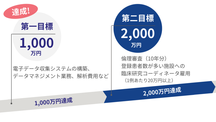 クラウドファンディング期間内に上記の目標金額を超えてご寄附をいただいた場合、第二目標を設定し、最終的な寄附総額に応じて継続時に必要となる経費の一部を確保します。毎年の倫理審査に加え、研究に参加いただいている先生方の負担を少しでも軽減すべく、特に登録患者数が多い施設への臨床研究コーディネータ雇用によるサポートへと活用します。