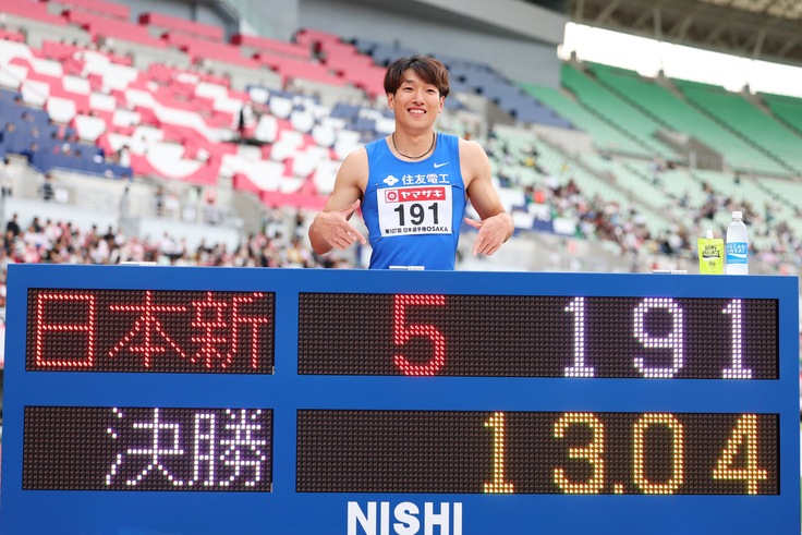 今年の日本選手権で13秒04の日本新記録で大会3連覇。