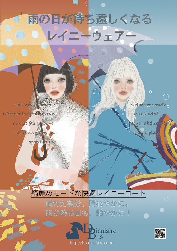 雨の日の傘さし自転車は危ないし、みんな足早。1年の3分の1が雨の日の日本。雨の日がもっと安全で楽しくならないかな?との思いを交差させ、今年1月にレインウェアのブランド[DICULAIRE BIS]を立ち上げ、日本のアーティストの作品をレインウェアにプリントし、展示会を開いています。今回は、千葉県の酒々井ワールドマーケットで、雨の日が楽しくなるようなレインウェアのショーを、若手芸術家とコラボレーションで開催したいと思っています。