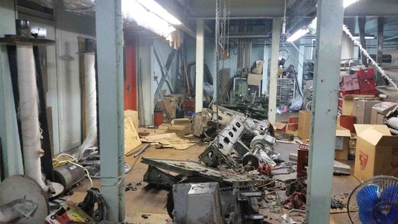 ほほとんど織機がばらばらになった状態です。これから工場の外に運び出すのですが、ばらばらにしたといっても大きな部品は、一つの重さが150kgから200kgくらいありますので、入り口にたどり着くまでの織機の間の狭い通路を台車に載せて運び出すのも一苦労ではありました。部品取りをしたあとのこれらの鉄も資源ですので鉄の回収業者に買い取ってもらいリサイクルされます。
