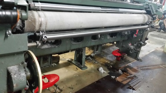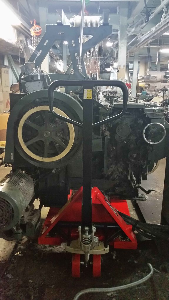 上の写真は、移動するレピア織機をバックレストを外してハンドパレットに載せた様子です。織機は電気配線と繋がっているので移動前にそれを外すだけでなく、8箇所アンカーボルトを打ってボルトで工場の床に固定してあるので、移動する前に、それらを外す作業が必要です。