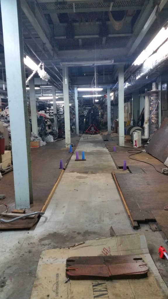 奥のほうにあった3台の織機を出して出来たスペースです。ここに工場内のレピア織機を移動してくることになります(イメージとしましては奥にレピア織機を詰め込んでいくという感じになります)。ジャガード織機があった場所で、柱が立っていて、その間が150cmしかないので、奥行きが180cmほどあるレピア織機を通してくるには、織機の後ろのバックレスト部分を外す必要があります。