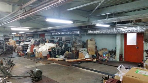 レピア織機を移動してスペースのできた工場内の様子です。一番奥の角にあるシャトル織機1台は部品が手に入らなくなったために、部品取り用に分解し、中央のシャトル織機は移動、右側の2台も工場内を移動し配置換えする予定です。