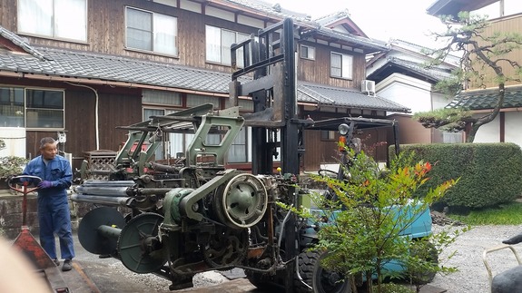 こんな感じで、トラックから織機を降ろした後は、フォークリフトで工場に運び込まれてきます。