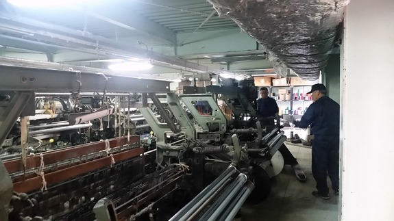 今回の織機移設のために林与の工場の南側半分に近いスペースを確保いたしました。上の写真は、左側の奥に最初の一台目の織機を運び入れ終わった様子ですが、このスペースを作るために置いてある糸や道具を動かしたり、織機3台とコーン巻き1台を部品取り用にばらしたり3日間ほどの徹夜に近い作業が続きました。同級生の友人も駆けつけてくれて夜中織機を動かすの手伝ってくれました。