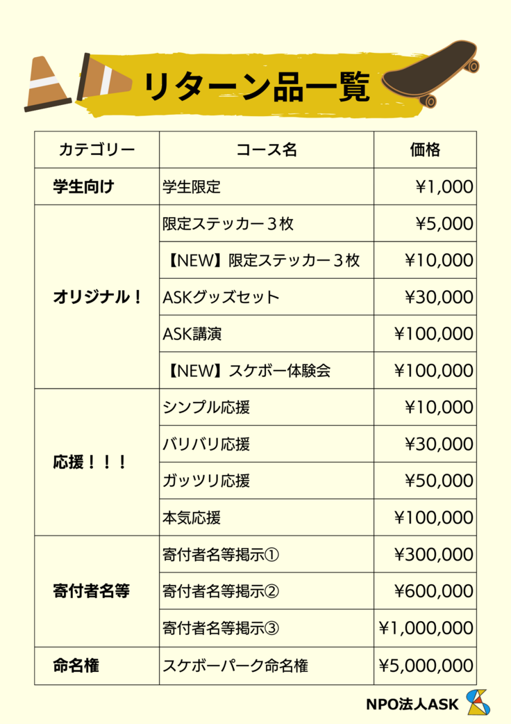 「スケボーパーク欲しいし、支援したい!だけどお金に余裕がない…」そんな学生や学生スケーター向けのコースになります。