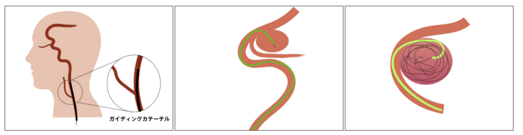 カテーテルを用いて、脳動脈瘤を内側からコイルというもので塞いで破裂しないようにする処置をします。