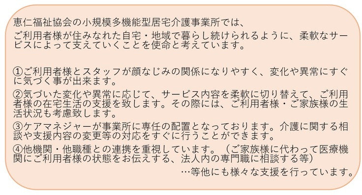 ご利用者様が住み慣れた自宅・地域で暮らし続けられるように、柔軟なサービスによって支えていくことを使命と考えています。