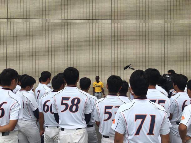 5日から練習に参加させていただいています。選手達と英語でうまくコミュニケーションを取りながら、日々励んでいます。日本の選手の練習に取り組む姿勢、また練習量の多さに驚きながらも意欲的に取り組み、「疲れた?」と尋ねても、首を縦には振りません。負けん気の強さが感じられ、野球部の選手達にも刺激にもなっているようです。野球歴10年以上の選手達と野球歴4年のカトー・エリック。切磋琢磨し、お互いにとってよりよい効果が生まれそうです。