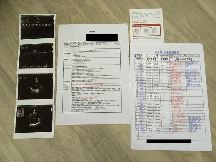 上は診断書(報告書)、エコー,血液検査、心臓病検査等。