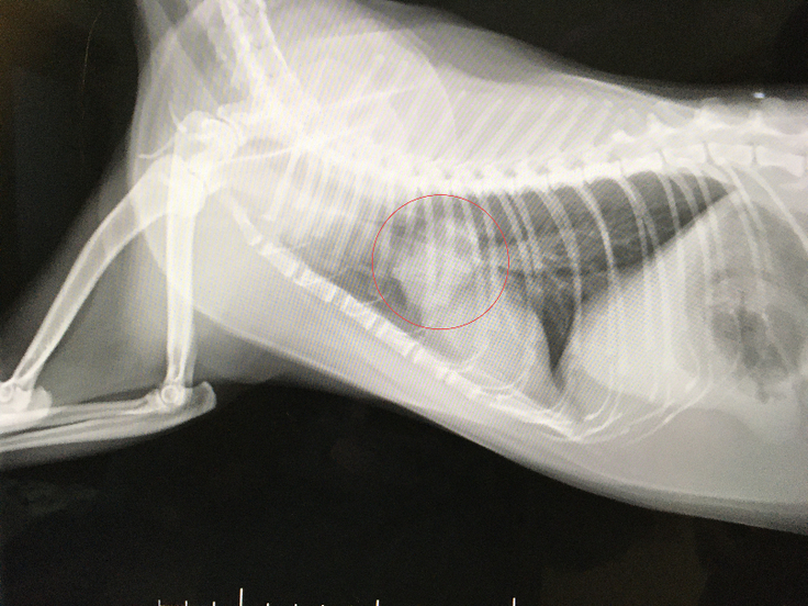 画像は、3.2cmの肺腺瘤(肺腺癌疑い)です。猫の肺腺瘤(肺腺癌疑い)は症例が少なく、開胸手術等や高度になるため、費用がとても高額になります。