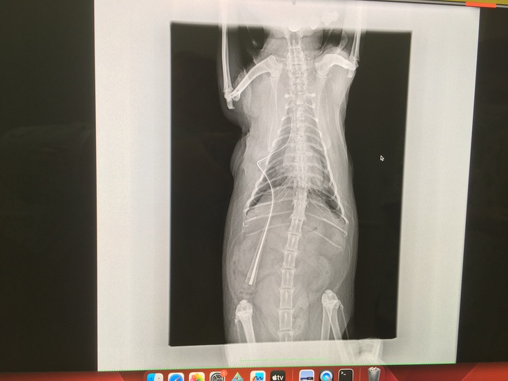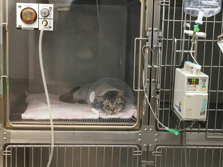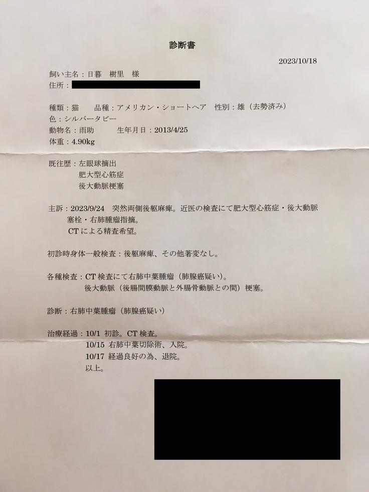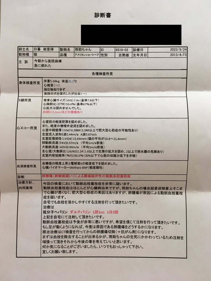 早急に診察して頂き、獣医師の説明によれば『ご家族の皆さん、入って来て下さい』との一声から始まり、『雨助君は大動脈血栓塞栓症ので、普通は心筋症から起こる症状だけど、今の雨助の心臓を見ても考えにくく、何処からきたのかわからない。大動脈血栓塞栓症との診断を受けると、自分が知ってる今までのワンちゃんネコちゃんは24時間以内に99%の確率で亡くなっている…あと、右肺に肺腺瘤が見つかりました。猫の肺腺癌の症例は少ないが、肺腺癌で間違いないと思う。』とのこと、『大動脈血栓塞栓症は24時間が峠、越えれば次は脚が少しでも動ける様に、72時間が勝負になる』ということでした。