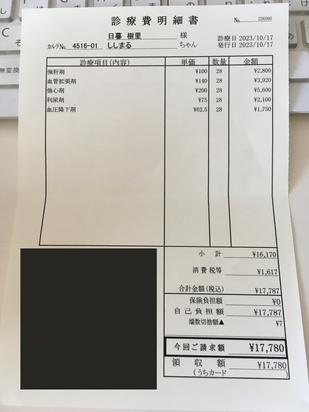 診察や検査、薬代で毎月¥17,780治療費(検査がある時は¥20,000以上)が、かかっています。