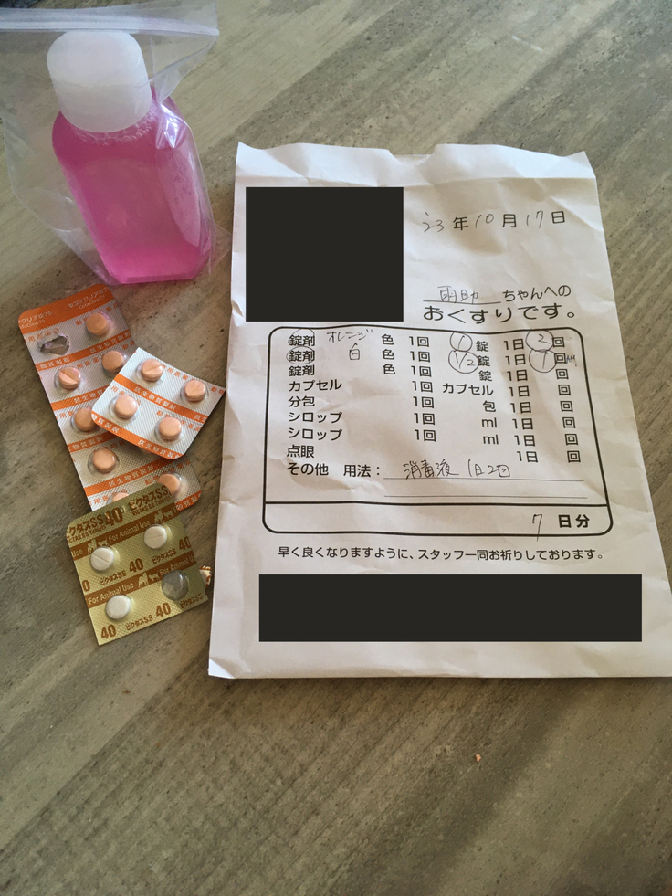 追記:9月30日 薬の追加・10月8日 後脚が動かず、擦って歩くため、右脚に大きな擦り傷でき、診察。化膿しているため、リンデロンVGローションを塗布開始