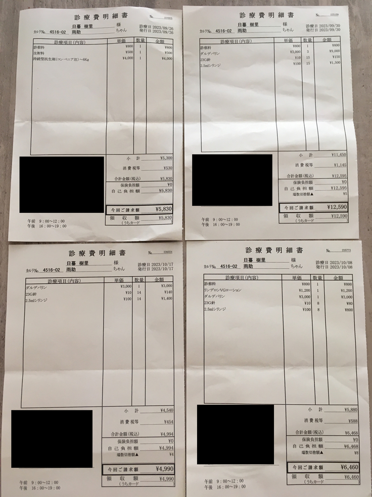 その間にも2回通院、1度につき¥15,000〜¥20,000検査や薬の補充等で必要でした。