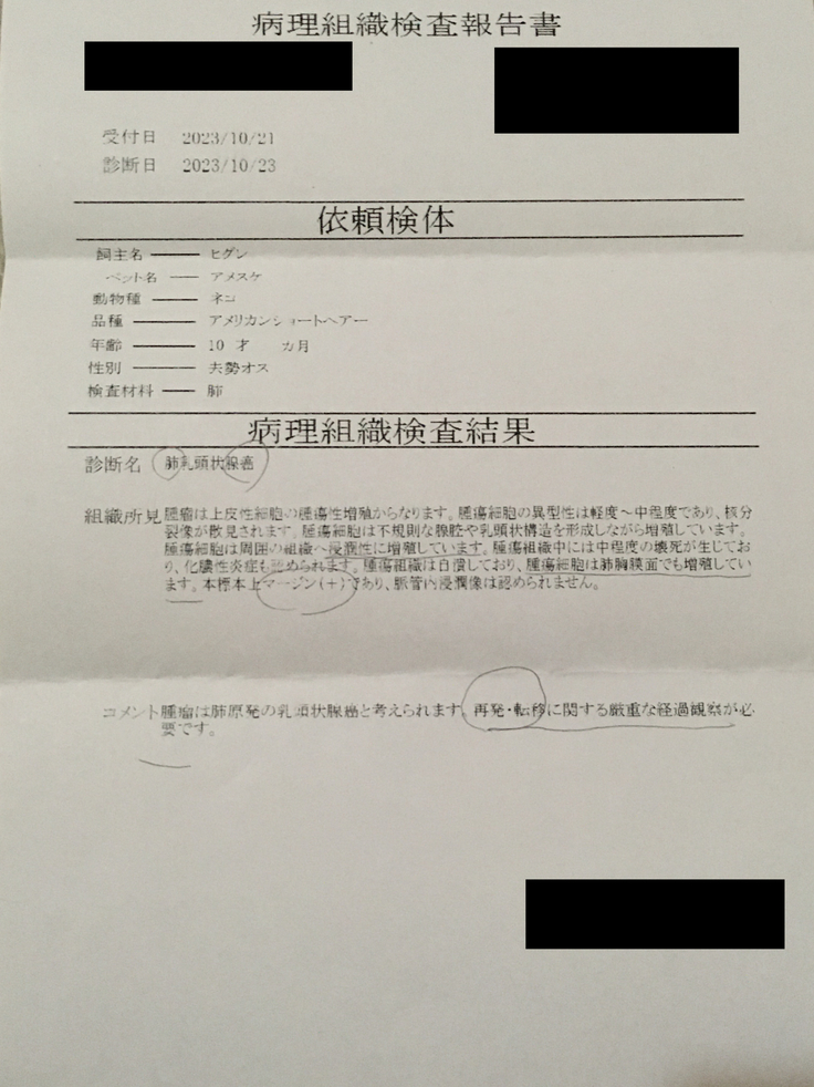 獣医師より「猫の肺腺癌は本当に症例が少なく、今回のパターンはもっと事例がない」と仰っしゃられました。