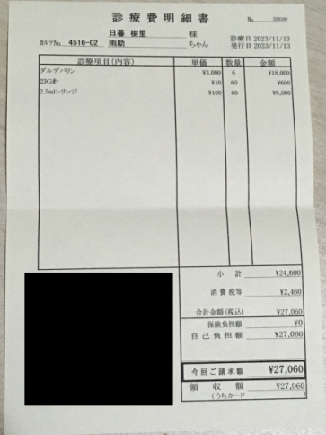 ↓本日の医療費明細書(ちなみに、雨助の親友兼家族のししまるは¥18,000程でした)
