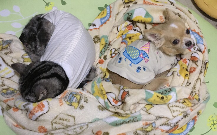 寒いので、微妙な距離を個々、毛布を好きな形にしてお昼寝してました☺