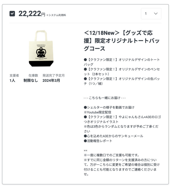 【グッズで応援】オリジナルトートバッグコース|22,222円