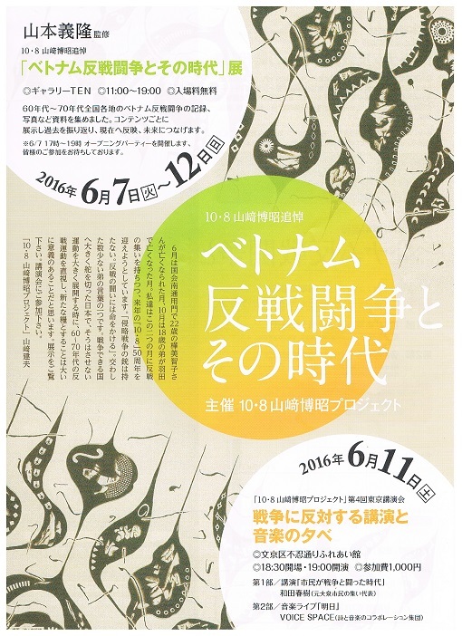 反戦の炎を絶やすことなく、過去から現在・未来へとつなげるため、2016年6月7日(火)から12日(日)まで、東京都台東区谷中のギャラリーTEN(テン)で「ベトナム反戦闘争とその時代―10・8山﨑博昭追悼」展を開催しました。