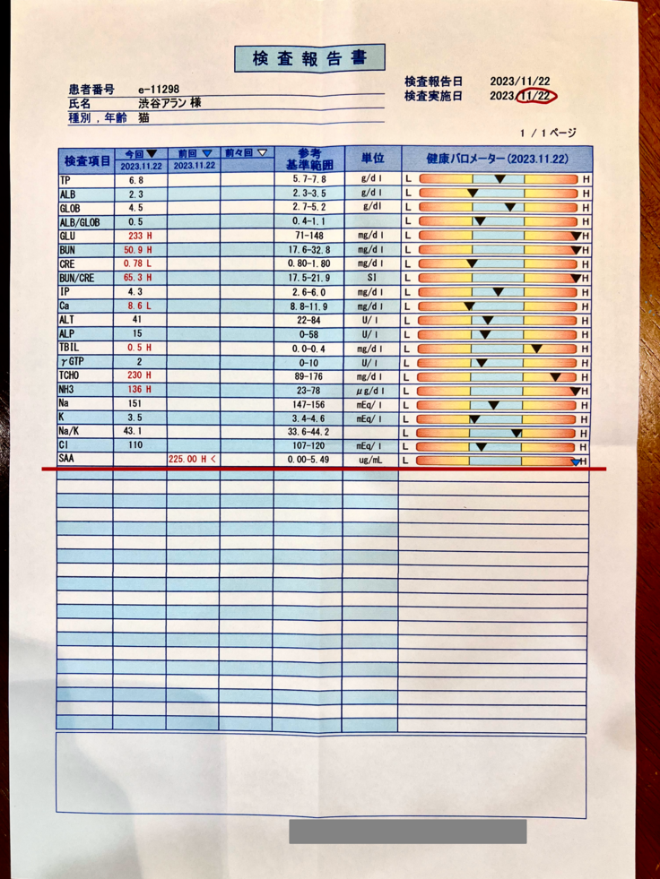 ▼最新の血液検査結果。HCT(血液の濃さ)の改善には時間がかかるので、慎重に経過を見ていく必要があります。