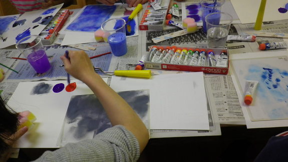 絵の具を広げる道具も、筆はもちろん、スポンジ、ローラー、様々な道具を用意しました♪
