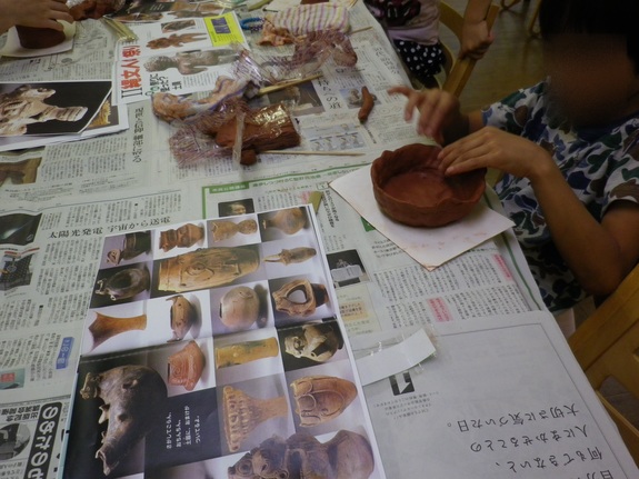 最初は、「こんなのでなく、自分の好きなものを作ろうよ」と言っていた子ども達も、土器の迫力に何かを感じたようです。