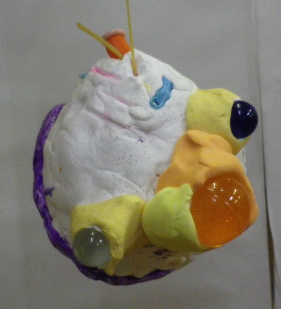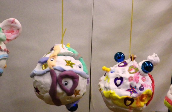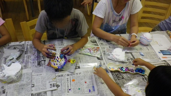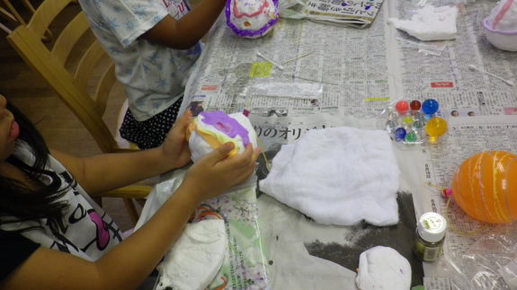 水風船のまわりに、粘土をくっつけ、ビー玉やキラキラパーツを思いおもいにくっつけていきました。