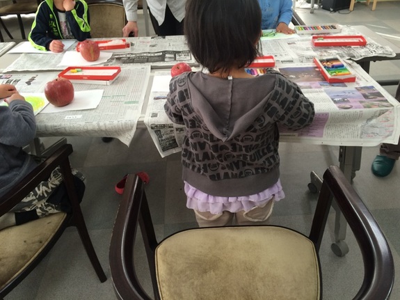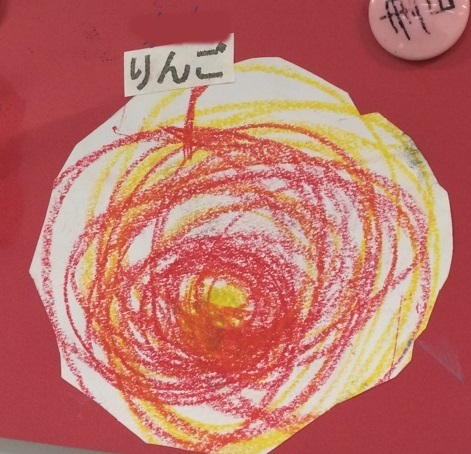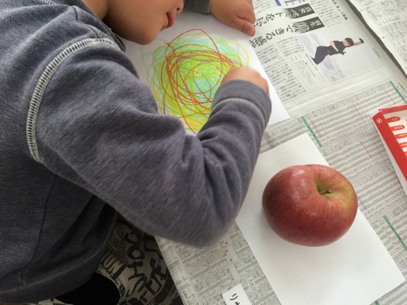 モチーフをみながら描くことは、まだ大変なこともありますが、みんなしっかりリンゴの存在が心に響いたようでした!