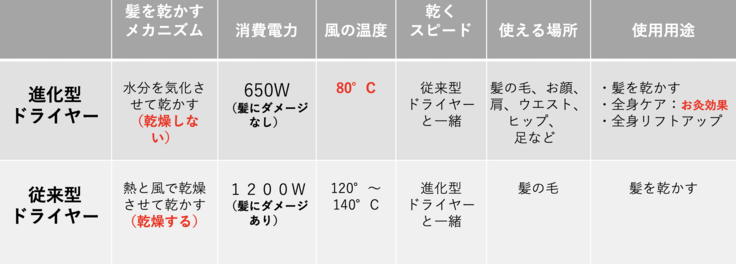 通常のドライヤーは、髪を乾燥させて乾かします。このときのリスクは、髪と肌が乾燥することにより、ダメージが生じます。進化型ドライヤーは、水分を気化させることにより、驚くほど髪に艶が出る新しいメカニズムのドライヤーです。ドライヤーの温度も、通常のものより低い設定になっているため、耳周りを乾かしても熱くありません。