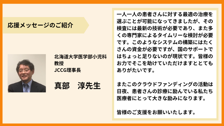 「脳腫瘍と闘う子どもたちへ、遺伝子検査を届ける研究を継続したい!」プロジェクトの成功を心よりお祈りしております。皆様、ぜひプロジェクトをご覧いただき、ご支援、ご協力をお願いいたします。