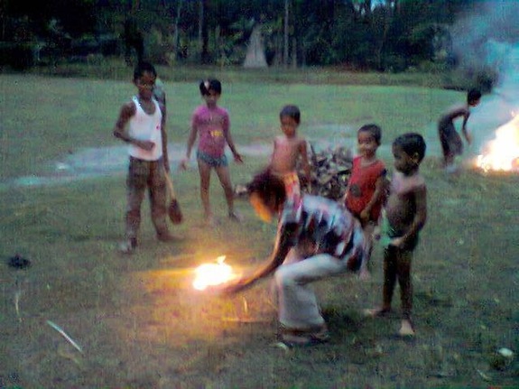 子どもたちは、お祭りの朝、木の枝に火をつけて、花火のようにして遊びました。