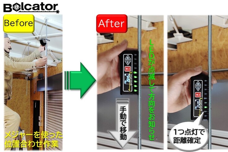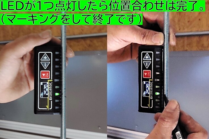 ・メジャーとボルケーターの作業比較(吊りボルトの位置合わせ)