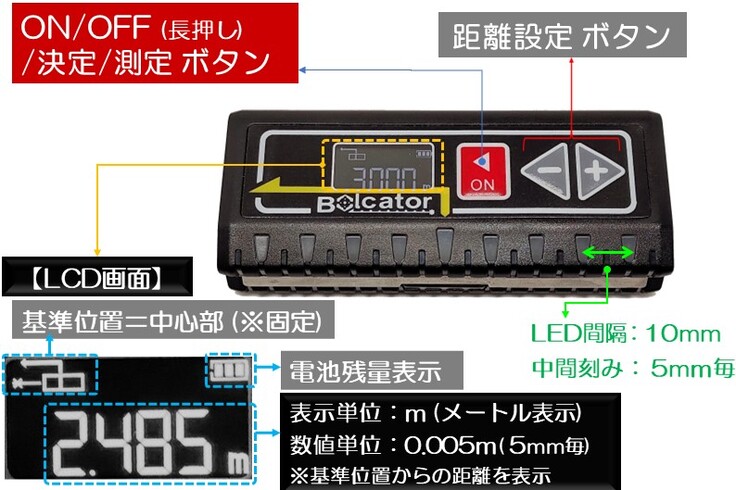 LCDの表示は5mm単位です。そのため、実際には±5mmの精度となります。