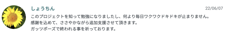 引き続き気を抜けない状況ではありますが、ここまでご支援いただいた皆様のためにも、なんとか達成させていきたいです。