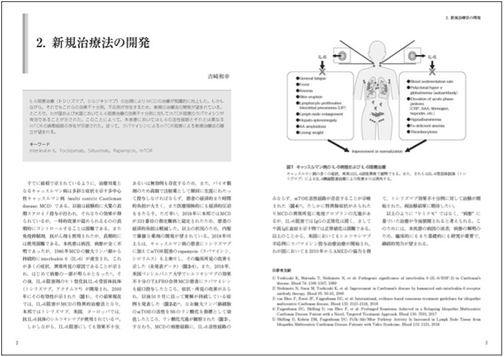 一方、吉崎班の事業成果として取りまとめられた「キャッスルマン病診療ガイドライン」が2020年12月に公開されるとともに、この班研究は川上純先生(長崎大学)を班長とする新たな研究班(川上班:註3)へと引き継がれました。この間、新型コロナウイルス感染症(COVID-19)の猛威に我が社も著しい影響を受けておりましたが、吉崎先生と川上先生の共同編集の形で本書の企画が結実し、このほどついに発刊に向けて大きく踏み出すことを得ました。