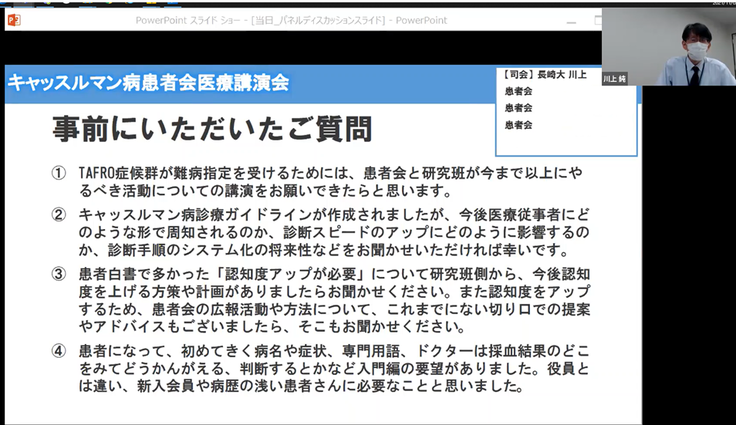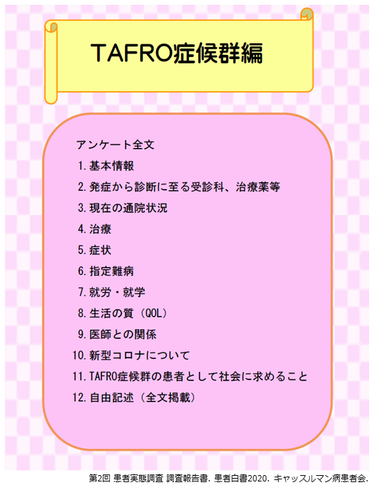 厚生労働科学研究費補助金難治性疾患政策研究事業「キャッスルマン病、TAFRO症候群、類縁疾患の診療ガイドラインの策定や更なる改良に向けた国際的な総意形成を踏まえた調査研究」班